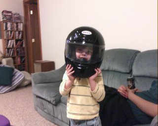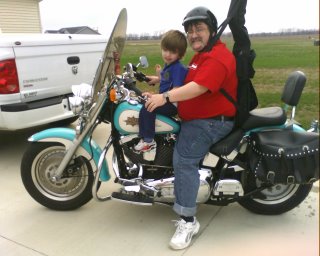 Well, here I am on my new fat boy, with my son (no, I didn't ride him anywhere on it). He was very excited to see the bike and get on it -- but he lost all interest once I started it up. My son has problems with loud noises, and even though my bike has Long Shot pipes with the baffles in them, it is a Harley, and it does make some noise.