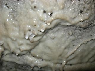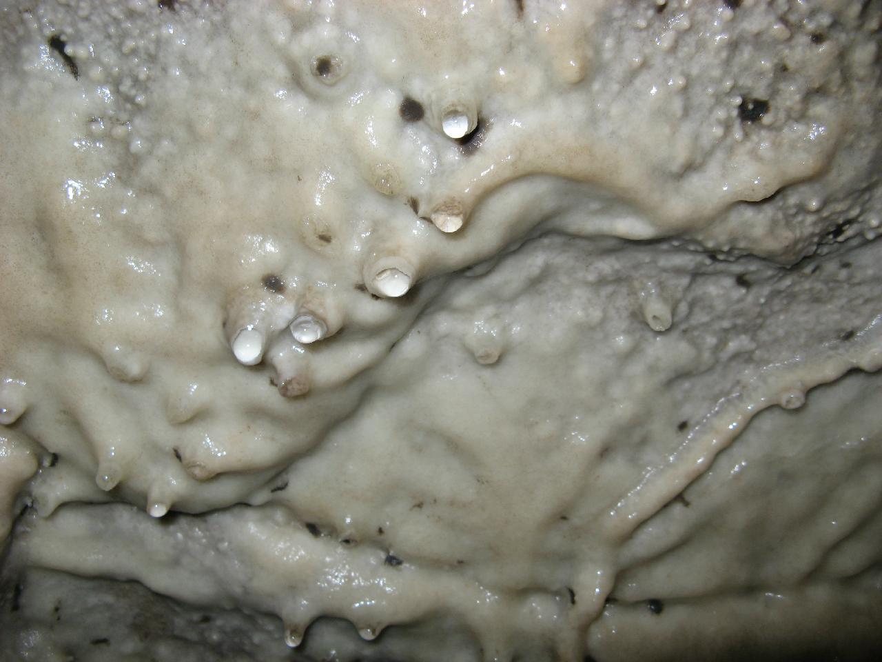 This is what happens when your neighbor drills for water and hits your cave. They decided it would be best for the cave to continue on down past the cave, then seal up around it. There is still water seeping in around the pipe, creating these formations which they can acurately date to over 60 years ago.