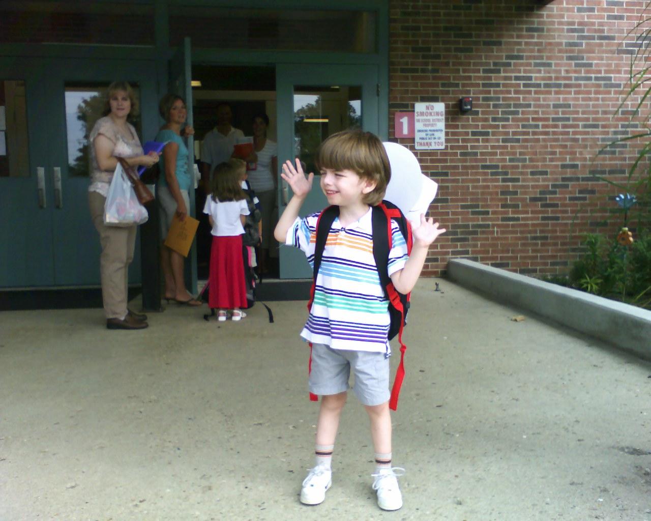 ...it's Kindergarten Boy!! Today was Alex's first day in kindergarten -- we went for an hour or so, and he met his teacher and some of his classmates. Mom asked if he was smaller than his classmates (a valid question, considering the shorts he was wearing were sized 24mo). I told her that he seemed to be somewhere in the middle. The school nurse was a little concerned about his eyes, but I informed her that he had surgery on them last week, and that they will get better soon (he's got the evil eye right now). Here's hoping for a good year...